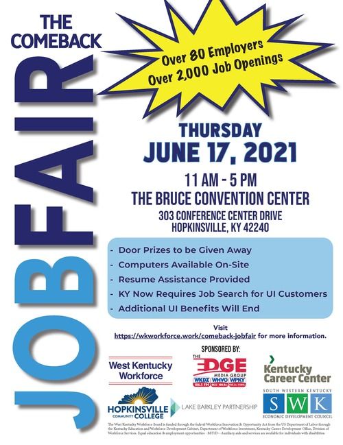 The West Kentucky Workforce Board invites you to participate in the ComeBack Job Fair on Thursday, June 17, 2021 at The Bruce Convention Center located at 303 Conference Center Drive in Hopkinsville, KY. Sponsors for the event include the West Kentucky Workforce Board, The Edge Media Group, Hopkinsville Community College, Lake Barkley Partnership and South Western Kentucky Economic Development Council. Should you have any questions, contact Tom Sholar at [email protected].