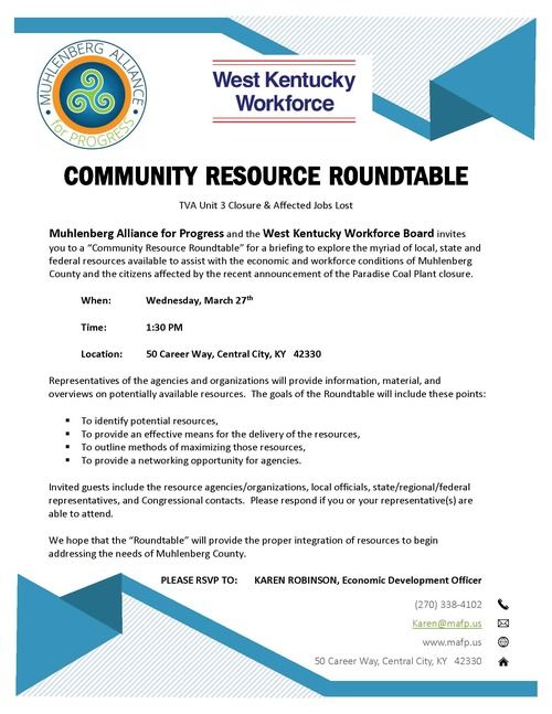 Muhlenberg Alliance for Progress and the West Kentucky Workforce Board invites you to a “Community Resource Roundtable” for a briefing to explore the myriad of local, state and federal resources available to assist with the economic and workforce conditions of Muhlenberg County and the citizens affected by the recent announcement of the Paradise Coal Plant closure.