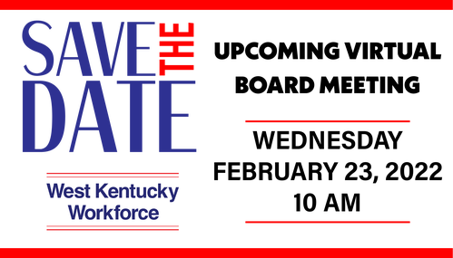 Please join us for the next West Kentucky Workforce Virtual Board Meeting on Wednesday, February 23, 2022 at 10 am via YouTube Live. If you have any questions or would like additional information, please contact Cindy Massie at (270) 886-9484 or at [email protected]. Thank you for your interest in the WKWB and its activities.
