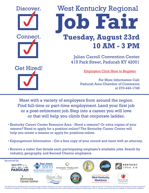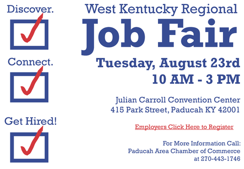 The West Kentucky Workforce Board has joined forces with a group of local partners to sponsor a job fair on Tuesday, August 23, at the Julian Carroll Convention Center, located at 415 Park Street in Paducah. The event will begin at 10 a.m. and end at 3 p.m. register here or call the Paducah Area Chamber of Commerce at 270-443-1746.