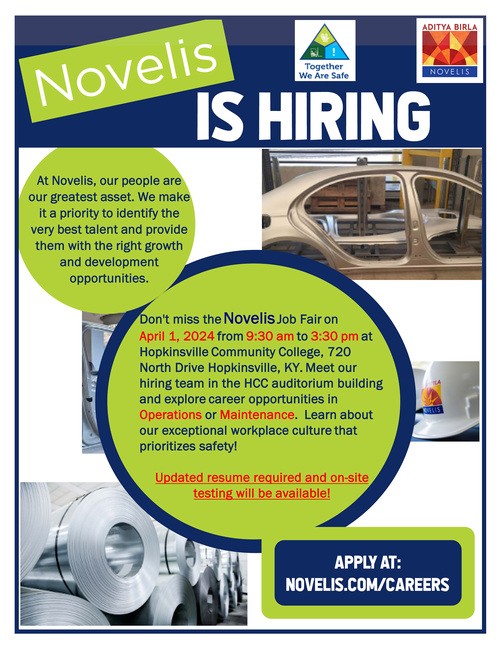 A Novelis Job Fair will be held on April 1, 2024, from 9:30 am to 3:30 pm, at Hopkinsville Community College in the Auditorium Building. Come explore opportunities in Operations and Maintenance. Apply at www.novelis.com/careers.