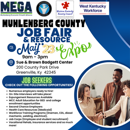 A job fair and resource expo is set to occur on May 23 from 9am - 3pm at the Sue & Brown Badgett Center located at 200 County Park Dr. in Greenville, KY. Opportunities at the event include: