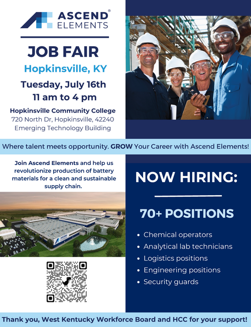 A job fair will be held on Tuesday, July 16th from 11 am to 4 pm at Hopkinsville Community College in the Emerging Technology Building located at 720 North Dr. in Hopkinsville, KY.