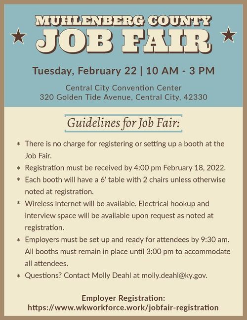 The West Kentucky Workforce Board invites you to participate in the Muhlenberg County Job Fair on Tuesday, February 22, 2022 at the Central City Convention Center- 320 Golden Tide Avenue, Central City, 42330. Sponsors for the event include the West Kentucky Workforce Board and the Muhlenberg Alliance for Progress. Should you have any questions, contact Molly Deahl at [email protected].