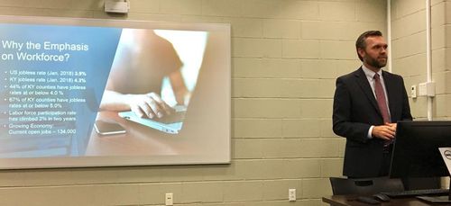 On August 30, 2018, over 70 individuals attended the Filling the Gap: A Summit on Meeting Rural Workforce Needs conference, which was held at Madisonville Community College. This event was hosted by the Madisonville-Hopkins County Economic Development Corporation in partnership with International Economic Development Council, Madisonville Community College, and the West Kentucky Workforce Board. The conference was aimed to provide tools and strategies to increase the pool of workers available to employers. Josh Benton, Deputy Secretary of the Kentucky Education and Workforce Development Cabinet, was the keynote speaker and discussed initiatives at the state level that are designed to help local communities in Kentucky improve the skills of their current and upcoming workforce. West Kentucky Workforce Board staff also presented at the conference. Molly Deahl, WKWB Business Liaison, discussed the role of the WKWB in the region and workforce opportunities available through Kentucky Career Centers. Marc Quesenberry, WKWB Veterans Transition Liaison, facilitated a panel of veterans and transitioning soldiers and discussed how to best engage this population.