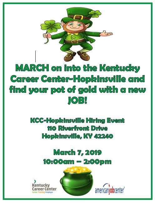 Whether or not you believe in luck, taking control of your own fate is always a good first step. Luck strikes best when you give it a chance to find you. That means doing all the things you need to do to get your job search started right and keep it moving. Make plans to be at the Kentucky Career Center-Hopkinsville Hiring Event on Thursday, March 7, 2019 from 10:00am-2:00pm. Martinrea, Harbor Freight, Douglas Autotech, Hankook Tire, Kauffman Engineering, Webstaurant Store, Crown Services, Huhtamaki, Mid Continent Spring, Fastenal, Murray State University, and Heavy Equipment College of TN are scheduled to be on-site. Thursday might just be your lucky day!