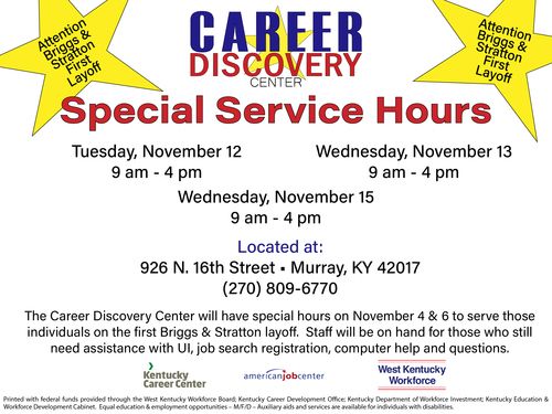 The Career Discovery Center will have special hours on November 12, 13 & 15 to serve those individuals on the first Briggs & Stratton layoff. Staff will be on hand for those who still need assistance with UI, job search registration, computer help and questions.