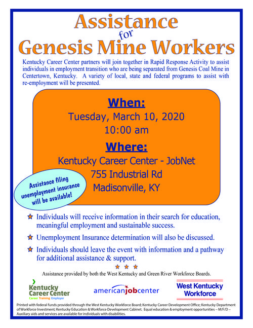Muhlenberg County Coal - Pride Mines Rapid Response EventGenesis Coal Mine Rapid Response MeetingsBrazeway Rapid Response EventsCareer Fair 2020 a Win Win for Jobseekers and EmployersCalvert City Convalescent Center Hiring EventFort Campbell Job FairHopkins County Job Expo 2020Genova Rapid Response Event