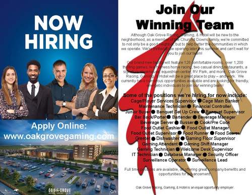 Posted in Oak Grove Racing Gaming and Hotel, Jobs, Careers, Now Hiring, Hiring