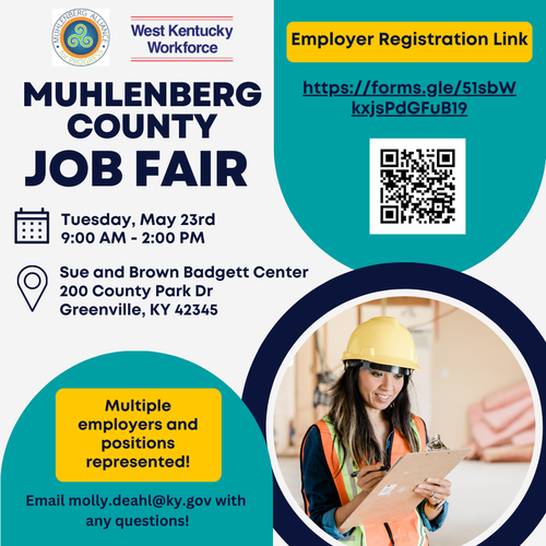 The Muhlenberg County Job Fair will occur Tuesday, May 23, 2023 from 9:00 am to 2:00 pm at the Sue and Brown Badgett Center located at 200 County Park Dr. Greenville, KY 42345. Employers can register the following link: https://forms.gle/51sbWkxjsPdGFuB19. For more information, contact Molly Deahl at [email protected].