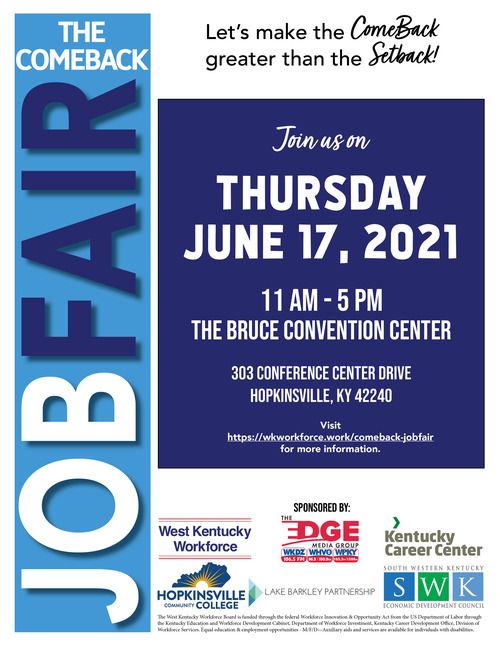 The West Kentucky Workforce Board invites you to participate in the ComeBack Job Fair on Thursday, June 17, 2021 at The Bruce Convention Center located at 303 Conference Center Drive in Hopkinsville, KY. Sponsors for the event include the West Kentucky Workforce Board, The Edge Media Group, Hopkinsville Community College, Lake Barkley Partnership and South Western Kentucky Economic Development Council. Should you have any questions, contact Tom Sholar at [email protected].